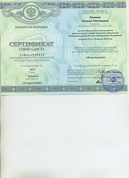 Сертификат участника научно- практического семинара «Психотерапия для младенцев и их родителей» Российско - Австрийского проекта по подготовке детских и подростковых психотерапевтов (2010), обучение по программе "Гимнастика мозга" , сертификат участника научно - практического семинара Стэна Таткина (США) " LOVE AND WAR IN INTIMATE RELATIONSHIPS: A Psychobiological Approach To Couple Therapy@".С 2010 г. участник Российско-Австрийского проекта по подготовке детских и подростковых психотерапевтов. Повышение квалификации: 2011 г. "Системная семейная психотерапия".