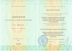 Сертификат участника научно- практического семинара «Психотерапия для младенцев и их родителей» Российско - Австрийского проекта по подготовке детских и подростковых психотерапевтов (2010), обучение по программе "Гимнастика мозга" , сертификат участника научно - практического семинара Стэна Таткина (США) " LOVE AND WAR IN INTIMATE RELATIONSHIPS: A Psychobiological Approach To Couple Therapy@".С 2010 г. участник Российско-Австрийского проекта по подготовке детских и подростковых психотерапевтов. Повышение квалификации: 2011 г. "Системная семейная психотерапия".